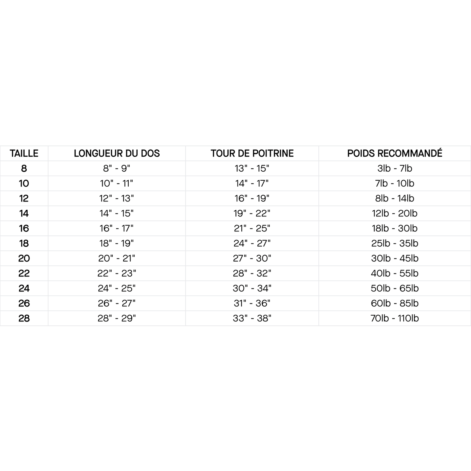 Large choix de tailles, couvrant des chiens de petite à grande taille (jusqu’à ~110 lbs selon la taille).