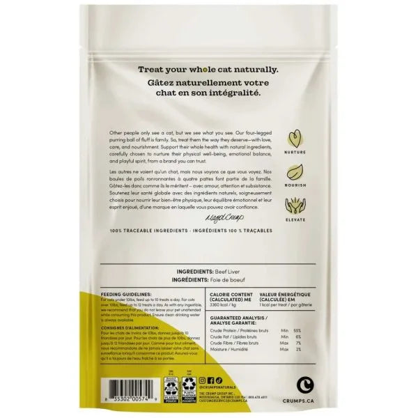 Les friandises pour chats au foie de bœuf lyophilisé Crumps’ Naturals sont composées à 100 % de bœuf nord-américain. Elles constituent une collation de haute qualité, riche en protéines et faible en calories. Lyophilisées délicatement pour préserver leur saveur et leurs nutriments naturels, ces friandises présentent une texture croquante dont les chats raffolent. Sans additifs artificiels, elles constituent une friandise saine et équilibrée qui contribue au bien-être de votre chat sans apport calorique supplémentaire.